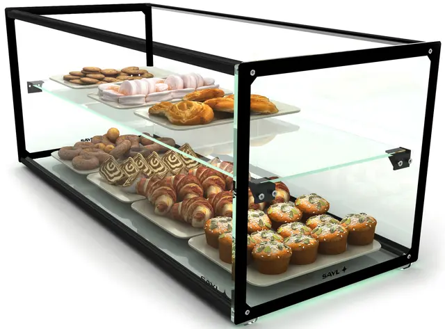 Inkludert skyvedører på betjeningssiden, samt innvendig LED-belysning. Overbygg i glass med buet front Rustfri eksponeringsflate BxDxH=84x38x17cm.