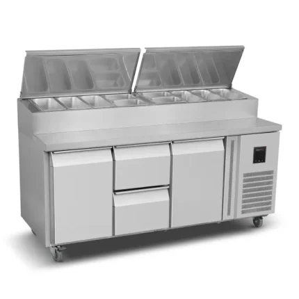 Kjølebenk med kapasitet på ca 390 liter. Med 2 dører og driftstemperatur mellom +2°C ~ +6°C. Laget av rustfritt stål innvendig og utvendig.