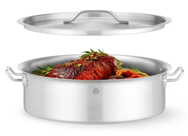 En robust konstruksjon i rustfritt stål, aluminium og 18/0 rustfritt stål som sikrer effektiv varmefordeling for profesjonell matlaging.