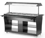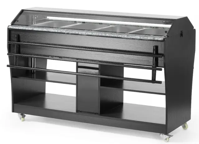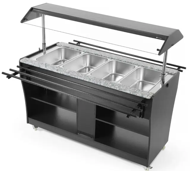 Denne buffeten er den ideelle løsningen for selvbetjeningsbedrifter eller arrangementer, da den har en hylle på begge sider for brett og sørger for at maten holdes perfekt varm.