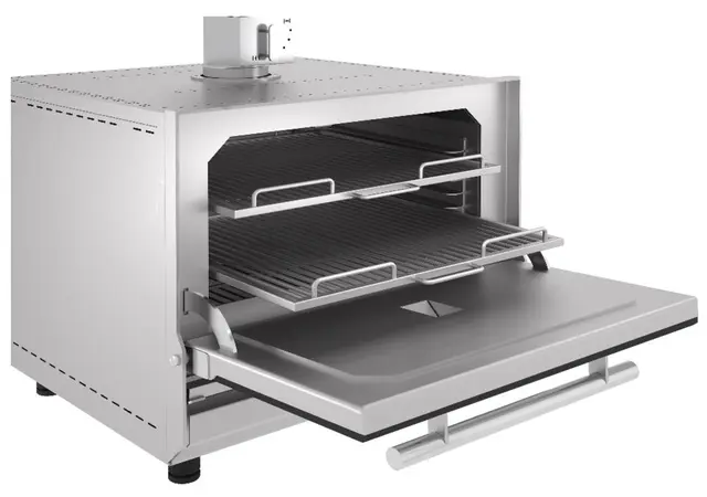 Temperaturregulering med regulerbar pipe. Med integrert temperaturindikator og støtsikker døråpningsfunksjon. Oppsamlingskar for stekefett og egen skuffe for aske.