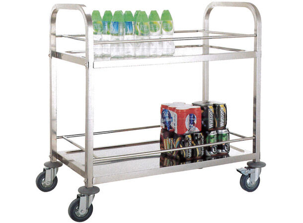 Med låsbare hjul, samt hyller med rustfrie støttestenger i alle sider