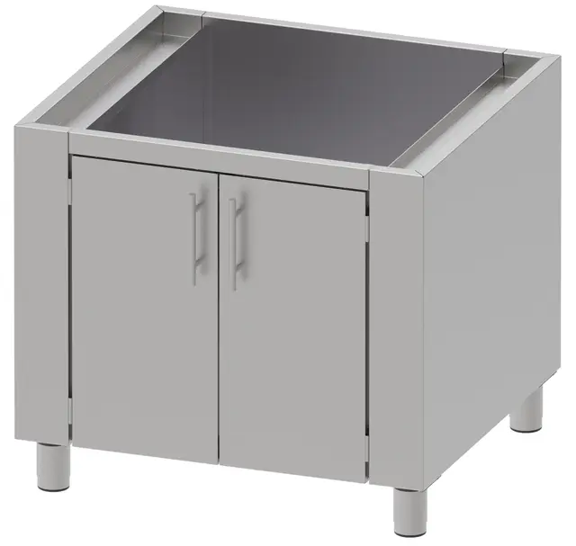 I rustfri utførelse. Med fire hjul og hengslede dører.