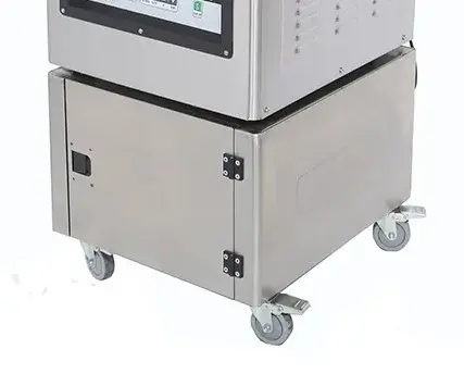 I rustfri utførelse. Med fire hjul og hengslede dører.