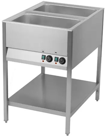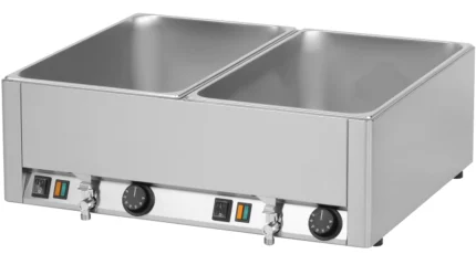 Vannbad 2/1 GN – Gulv model- Frittstående. Vannbad 2/1 GN (100505026) Med betjeningspanel og håndtak på kortsiden. Hver av de 2 GN- brønnene har trinnløs temperaturjustering. Lukkede elementer med tett bunn gir enkelt renhold. Separat avtapping av hver brønn under. Max containerdybde: 200 mm. Kapasitet: 2 stk 1/1 GN Betjeningspanel på kortsiden BxDxH cm: 60x67x90
