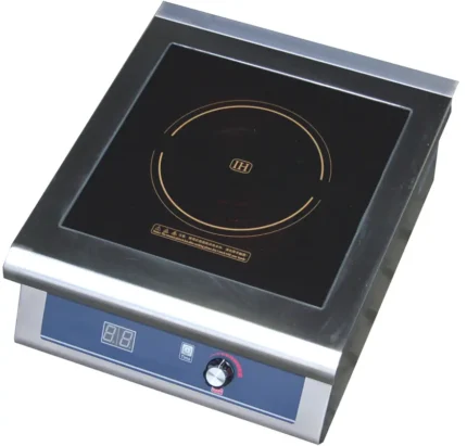 Induksjonskoketopp – 5000 W 1 fase 230 Volt. Rustfri utførelse. Max belastning: 40 kg. Glass-topp: 32x32cm. Varmesirkel: ø21cm. Leveres med gummikabel, uten støpsel. 9-trinns effektjustering, eller temperaturjustering. Diameter oppvarmet område: ø23cm. Max diameter for kasseroller: ø30cm. BxDxH: 40x48x22cm
